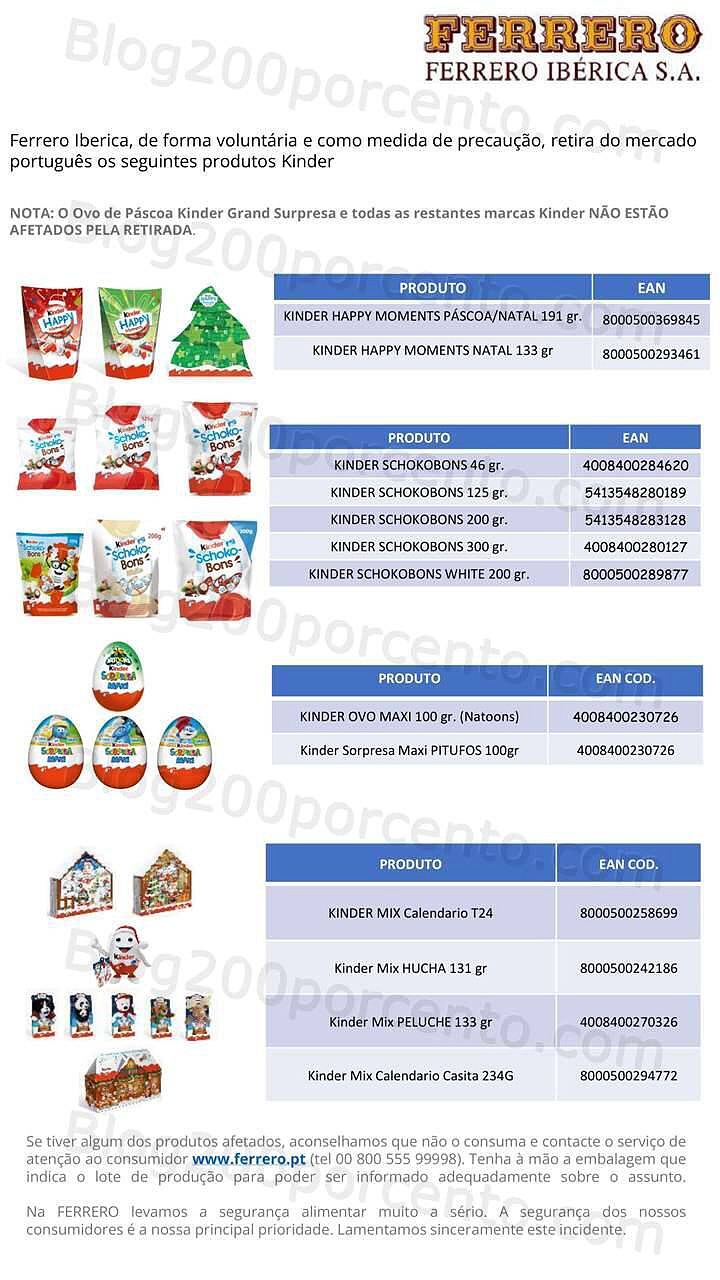 Ferrero Iberica, de forma voluntária e como medida de precaução, deu ordem de retirar do mercado português alguns lotes dos produtos abaixo indicados, fabricados na Bélgica, depois de alguns casos de salmonela terem sido registados no Norte da Europa: