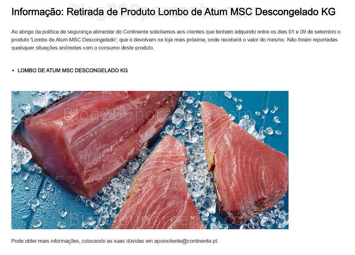 ALERTA - Retirada de produto CONTINENTE Lombo de Atum Descongelado!,