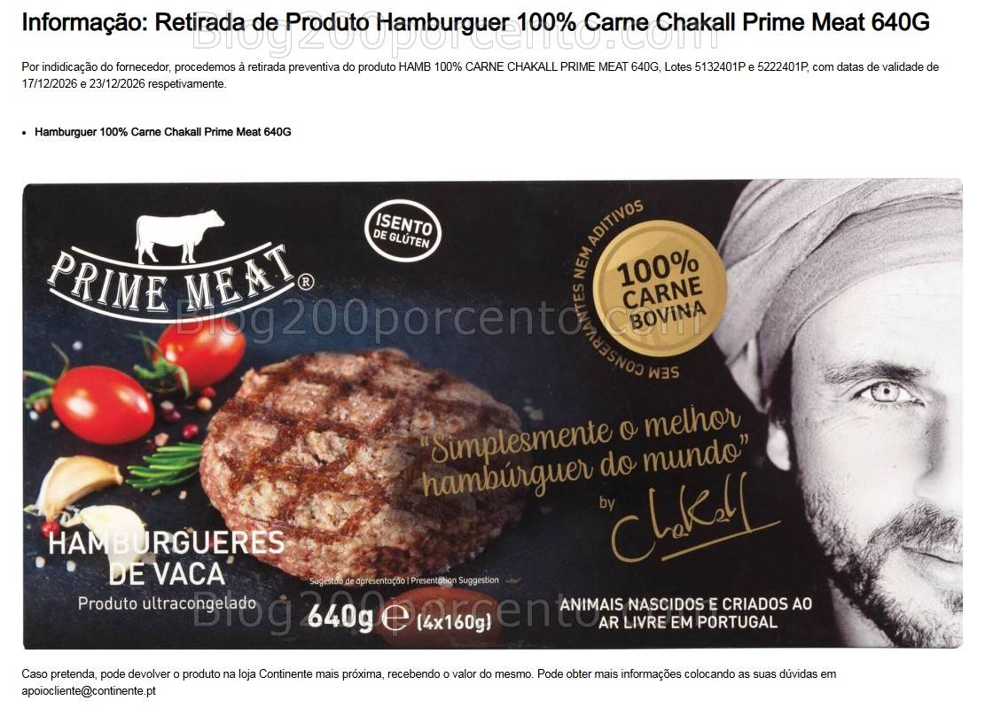 ALERTA - Retirada de Produto CONTINENTE Hamburguer 100% Carne Chakall Prime Meat 640G,