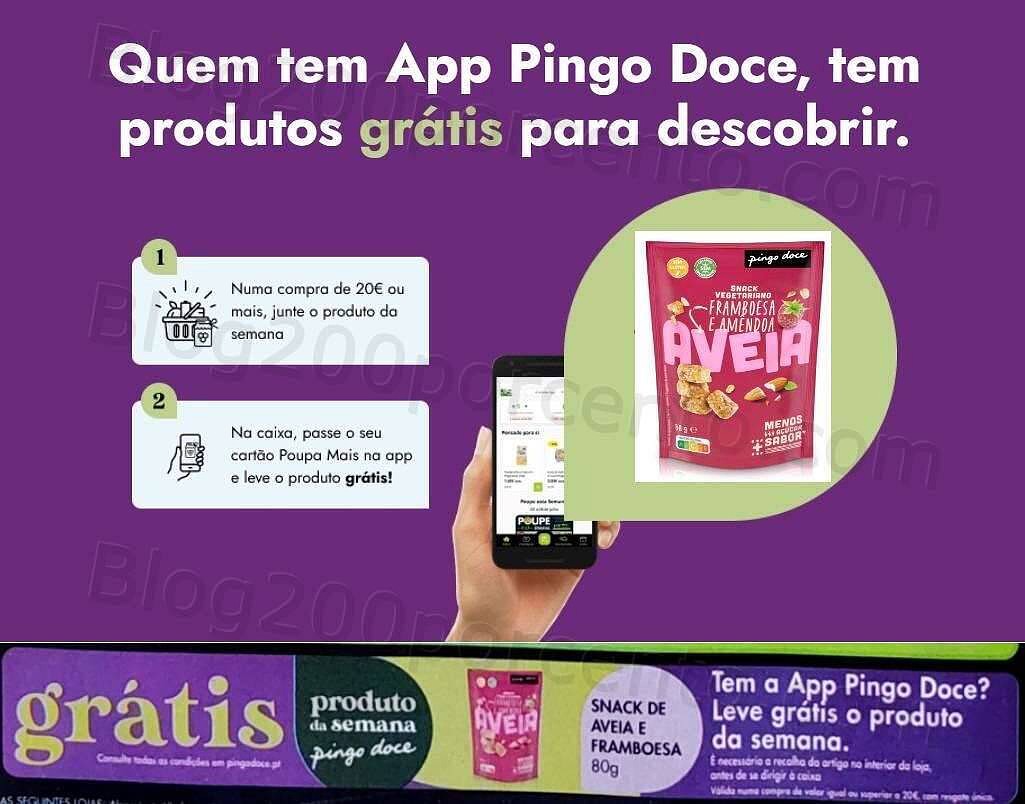Campanha válida de 9 a 15 de agosto de 2022 em todas as lojas Pingo Doce de Portugal Continental e Madeira numa compra de valor igual ou superior a 20€, valor líquido de promoções. Oferta de desconto equivalente ao valor de 1 Unidade Snack de Aveia e Framboesa Pingo Doce 80g., líquido de promoções, sendo exclusiva para clientes com cartão Poupa Mais registado até 24 horas antes da compra e associado na App Pingo Doce pelo menos 15 minutos antes da compra. O valor de 1 Unidade Snack de Aveia e Framboesa Pingo Doce 80g., não conta para o valor mínimo de compra. Estão excluídos para o valor da compra os seguintes artigos: Leite infantil 1 e especiais, livros, marca Code, medicamentos (MNSRM e veterinários), Testes de detecção rápida à Covid-19, máscaras de protecção facial, luvas, álcool (etílico, gel e spray), Sushi Daily, Sushi Gourmet, custo de entregas ao domicílio, produtos adquiridos a crédito, Experiências Odisseias, gás e acessórios, lotaria, cartão Presente, cartão Pré-pago NOS, taras e sacos de compras (plástico, papel, ráfia e juta), Peluches e Álbuns Frumania. A promoção não é válida nos Restaurantes, espaços Café e Bolos, Outlet, lojas BemEstar, postos de abastecimento Pingo Doce, lojas PD&Go, Nova SBE, plataformas Glovo, bringeat.pt, takeaway.com, serviço de encomendas Take Away e Mercadão. Consulte todas as condições em pingodoce.pt Válida numa compra de valor igual ou superior a 20€, com resgate único.