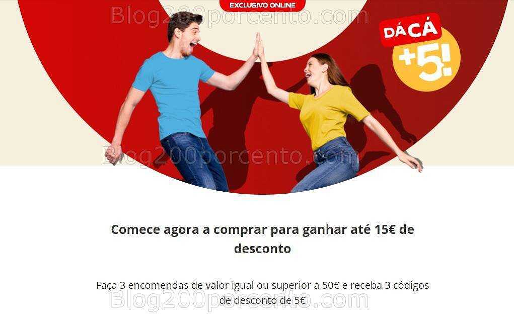 Ao realizar 1 (uma) encomenda de valor igual ou superior a 50€, entre 20 e 26 de maio de 2024, terá direito a 1 (um) código de 5€ de desconto direto para utilizar numa nova encomenda de valor igual ou superior a 50€, entre os dias 3 e 9 de junho de 2024. Com essa encomenda, terá direito a 1 (um) novo código de 5€ de desconto direto para utilizar numa nova encomenda de valor igual ou superior a 50€, entre os dias 17 e 23 de junho de 2024. Com essa encomenda, terá direito a 1 (um) terceiro e último código de 5€ de desconto direto para utilizar numa nova encomenda de valor igual ou superior a 50€, entre os dias 1 e 7 de julho de 2024.