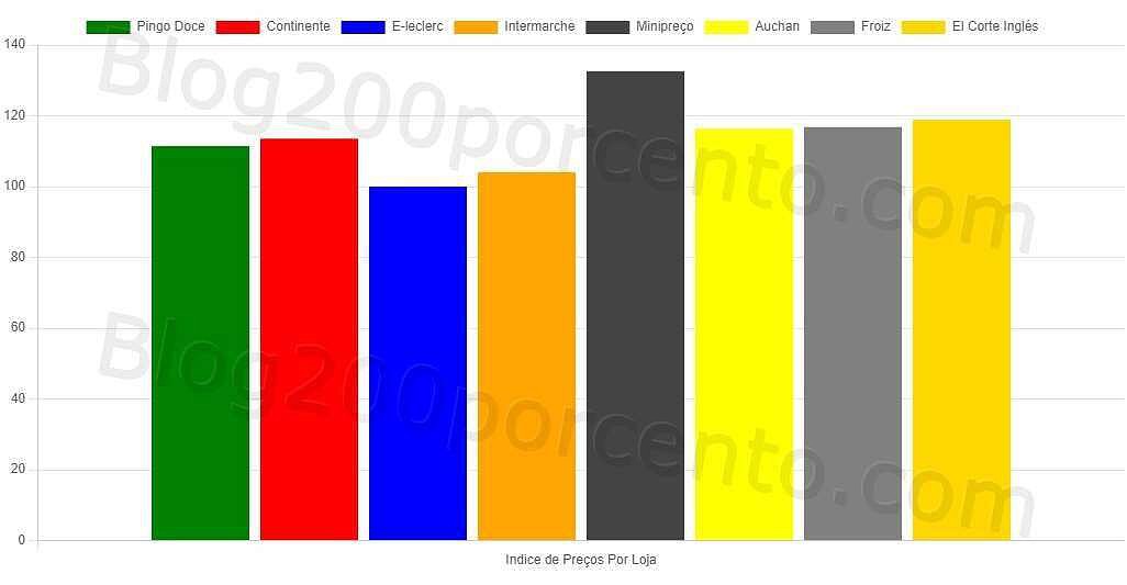 ( No Gráfico apenas entram os Produtos do nosso cabaz que existam à venda em todas as lojas, assim e por ex a Perna de Peru fica de fora, pois não existe numa das lojas, não se tem em conta cupões de desconto e outras formas de poupança )